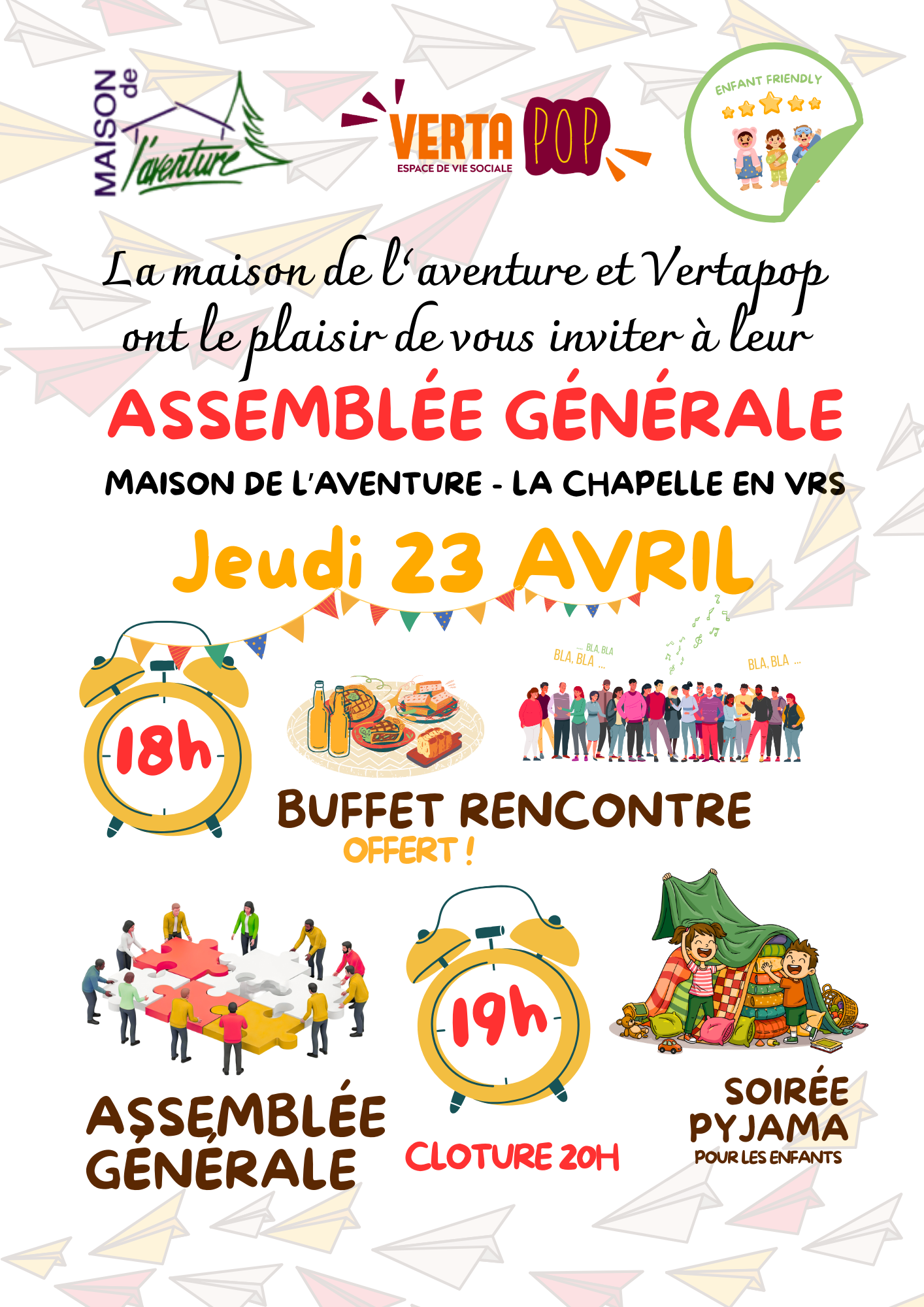 Rendez vous le jeudi 23 avril à 18h autour d’un buffet partagé. N’hésitez pas à venir en famille, il y aura de quoi occuper tout le monde, petits et grands !